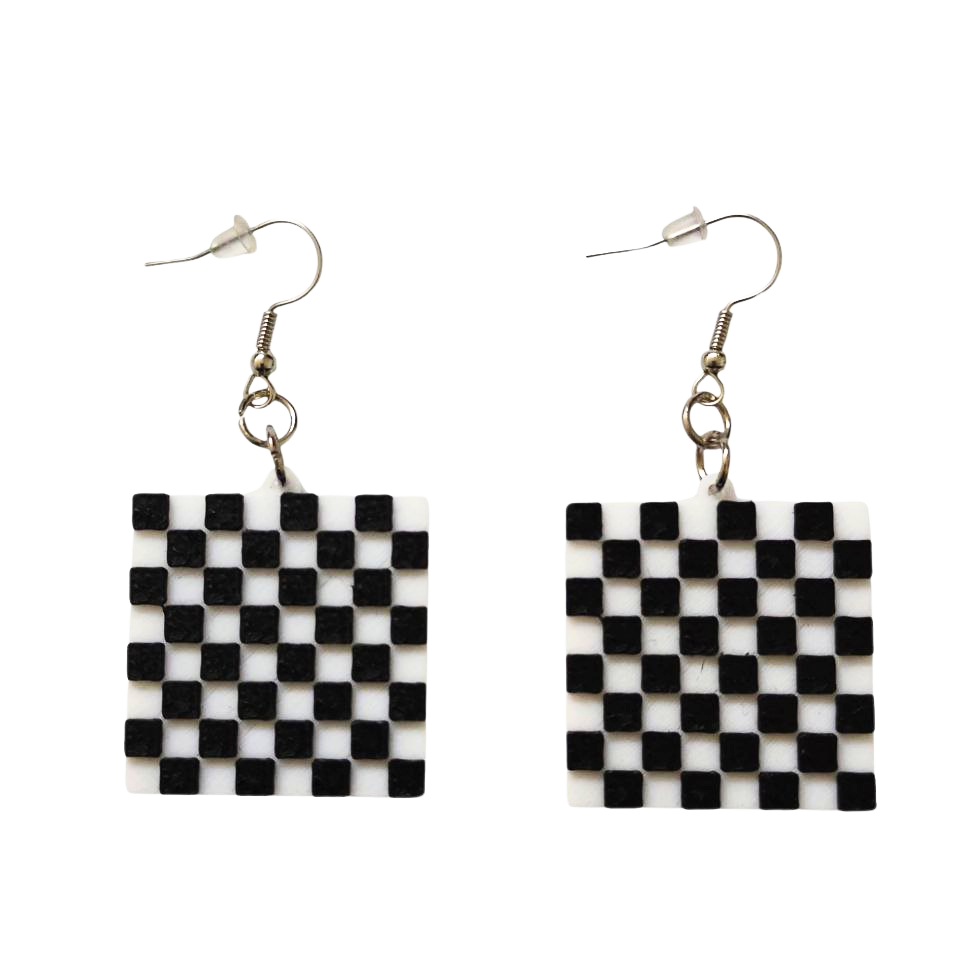 El diseño cuadrado de estos aretes presenta un patrón de cuadros en blanco y negro que es instantáneamente reconocible y atractivo. El contraste audaz entre estos dos colores clásicos les da un aire de modernidad y minimalismo, permitiendo que destaquen sin ser excesivamente llamativos. La textura en relieve de los cuadrados agrega una dimensión visual interesante, haciendo que la pieza se sienta más elaborada y artística.