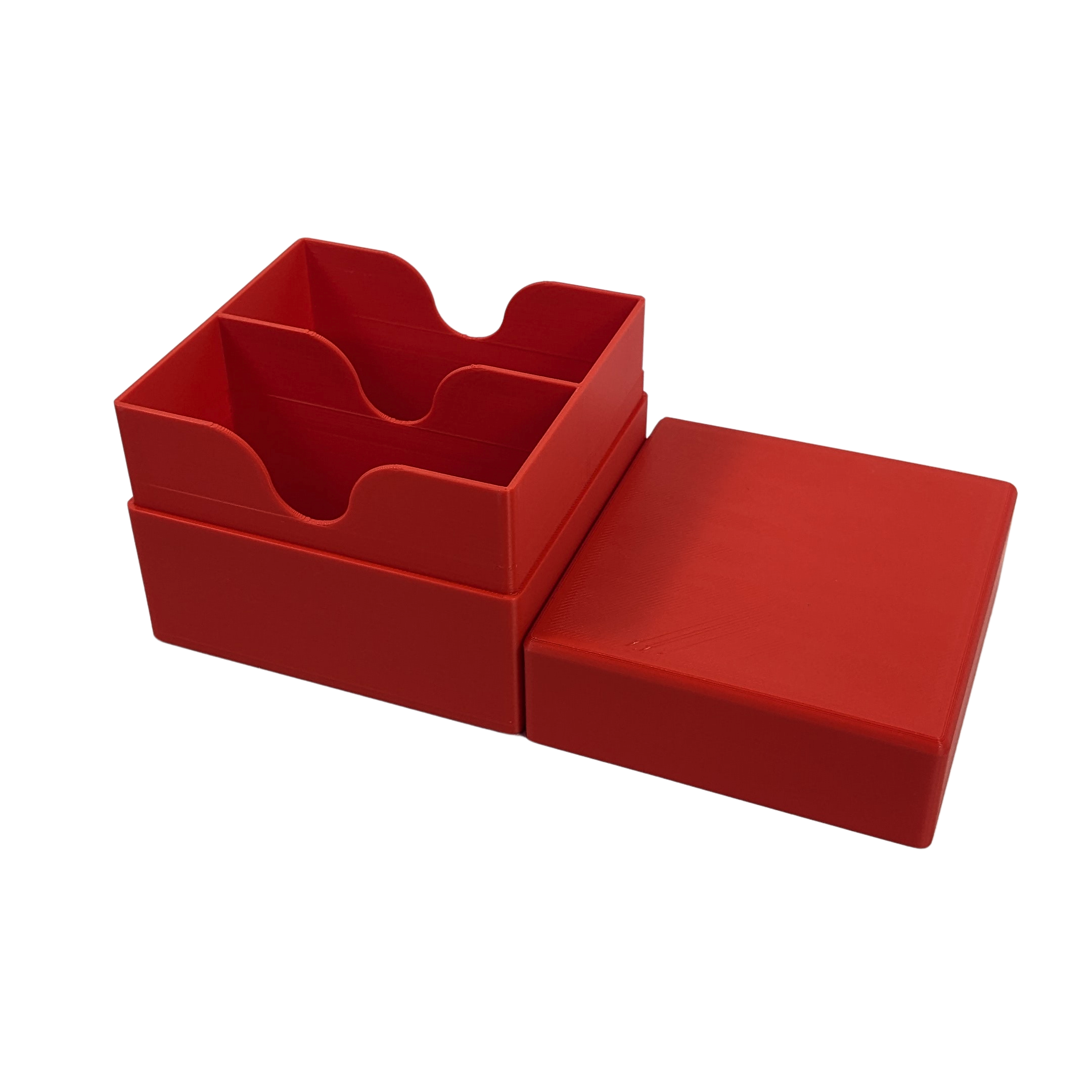 Con la caja dual, cada partida se convierte en una experiencia organizada y emocionante. Diseñada especialmente para quienes aprecian la estrategia y la planificación, este deck con dos compartimientos es el complemento ideal para tu colección, garantizando la protección y almacenamiento de tus cartas, dados y figuras de rol favoritas. Fabricada en plástico resistente, su durabilidad asegura que tus cartas estén siempre en perfectas condiciones, listas para el próximo partida.