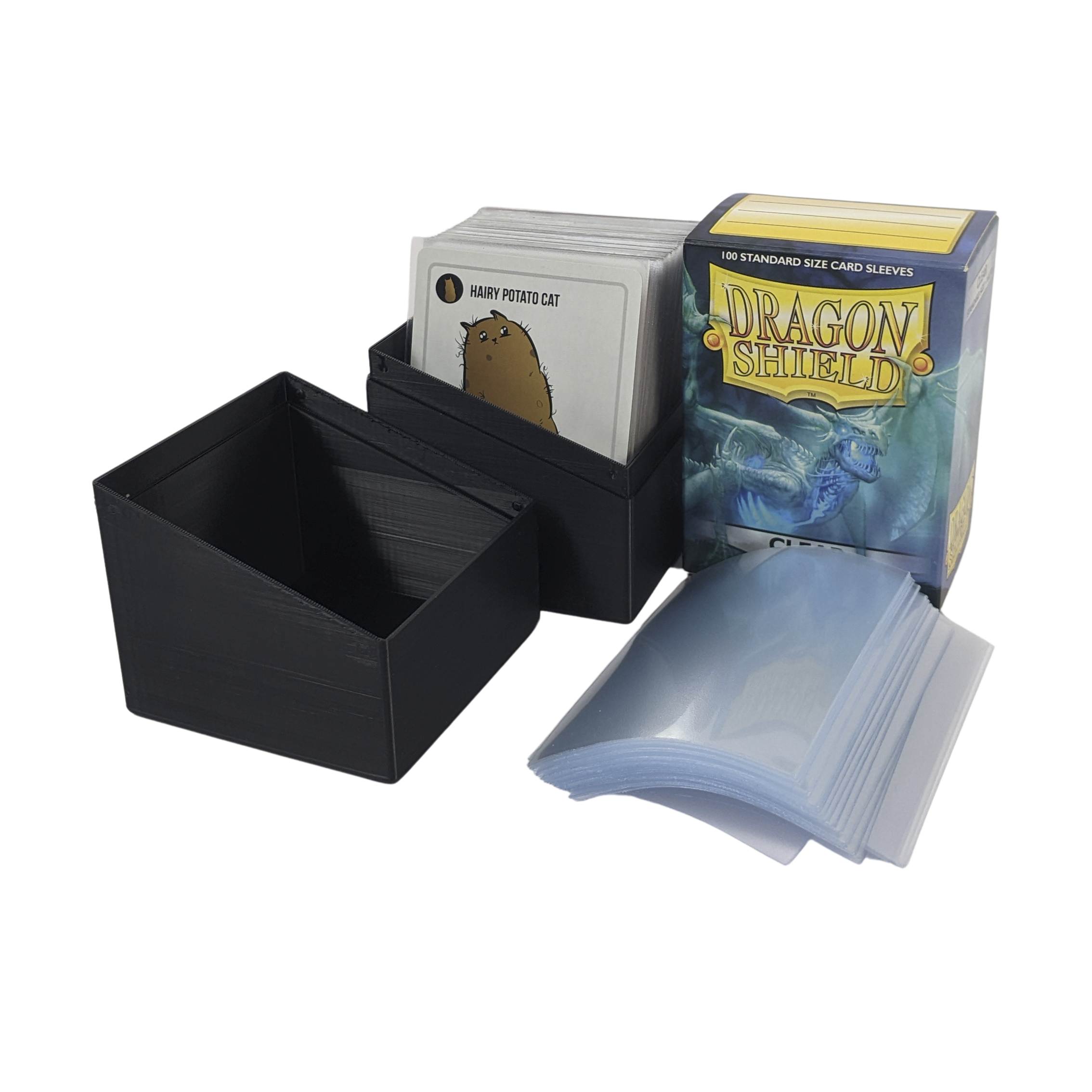 Combo con contenedor abierto + protectores (sencillos o premium). Protege y organiza tus cartas con un diseño práctico y resistente.