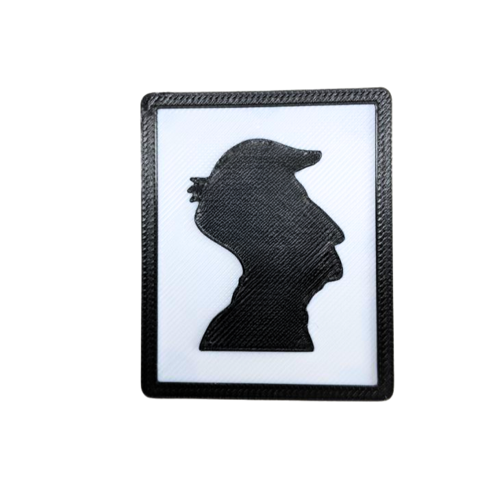 El imán presenta la silueta en negro de un busto de un hombre de perfil, inspirado en el famoso «Viernes de siluetas» del director Skinner. El diseño simple pero reconocible, con un fondo blanco y un borde en relieve, captura perfectamente el estilo de la escena y lo transforma en un accesorio práctico y coleccionable.