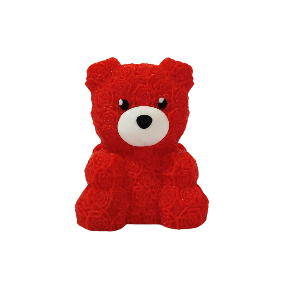Elaborado con una textura que simula un campo de pequeñas rosas, creando un efecto visual y táctil que es delicado y encantador. El color rojo intenso no solo es llamativo, sino que también representa la pasión, el romance y el afecto más profundo. La combinación del rostro tierno del oso con la elegancia de las rosas lo convierte en una pieza artística que destaca entre los regalos tradicionales.
