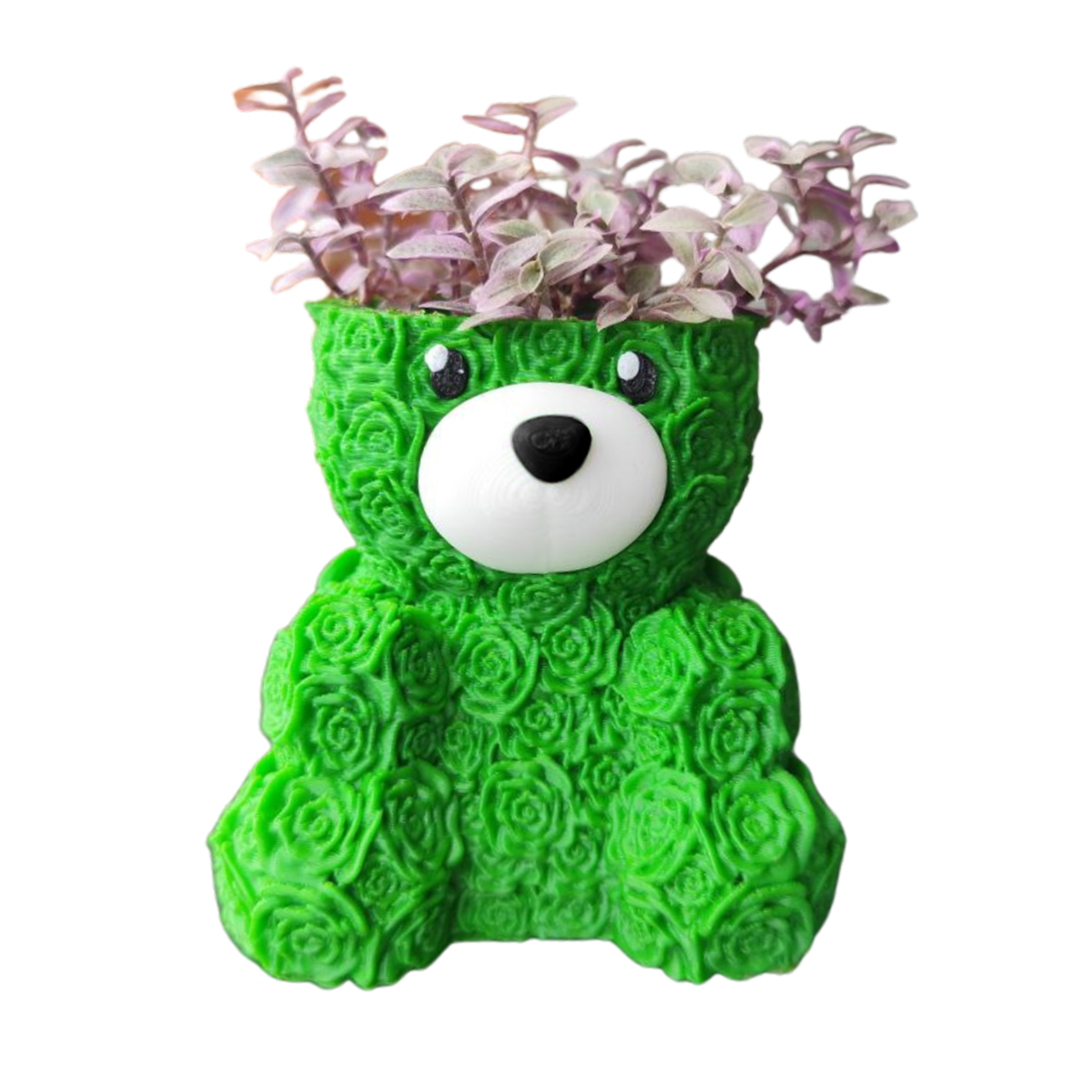 Maceta verde con diseño de oso floral, ideal para plantas pequeñas. Incluye orificio de drenaje para un cuidado adecuado.
