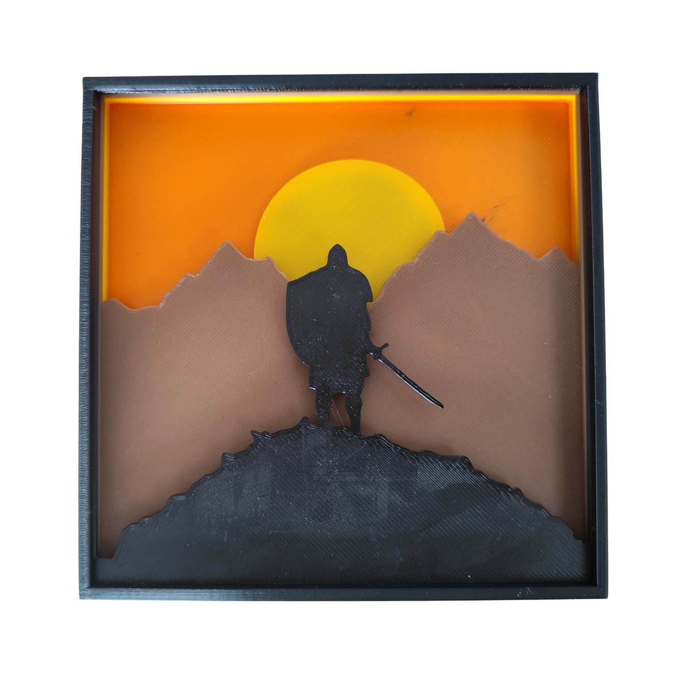 Este cuadro en 3D tipo shadow box es una pieza artística que combina creatividad, detalle y profundidad para dar vida a una escena épica. Elaborado por capas superpuestas que generan un efecto tridimensional, presenta la silueta de un guerrero erguido frente a un imponente paisaje montañoso con un sol radiante al fondo. Cada elemento ha sido diseñado con precisión, logrando transmitir fuerza, valentía y el espíritu heroico del personaje central.